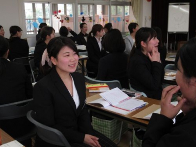 今回の研修では、30名の職員が参加し社会人としての基本である挨拶や身だしなみ、電話応対、来客応対など教えて頂きました。来客対応では、各園でグループに分かれて、お茶やコーヒーの出し方を職員同士で指摘しあいながらロールプレイを行いました。その場で指摘しあうことで自分の間違いを正すことができ、今後、来客対応をする際に自信を持って正しい「おもてなし」をすることができるのだと感じました。