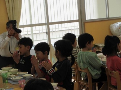 その日はちょうど月に一回『保育園産の米』からの一品が給食のメニューとして提供される日とあって、子ども達の昼食時の姿もご覧いただきました。