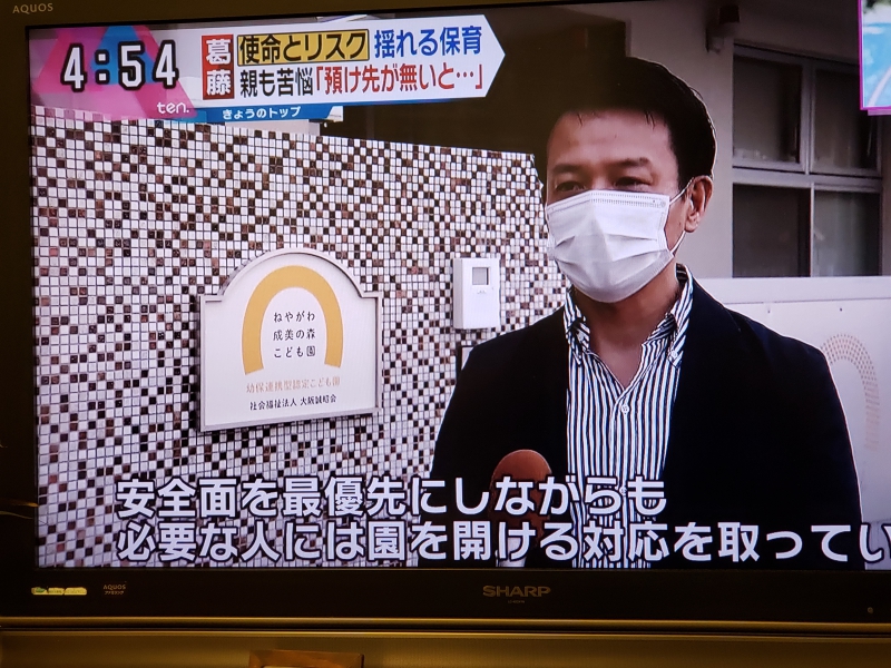 2020年04月23日(木) 読売テレビ 「かんさい情報ネット ten」の取材がありました! カテゴリー:マスメディア取材等 令和2年4月21日(火)の「かんさい情報ネット ten」に新型コロナウイルスにおける緊急事態宣言から2週間経った現状を取材するという内容で、保育現場での対応や現状についての取材がありました。 理事長と保護者にインタビューがあり、緊急事態宣言後での保育現場での状況についてお答えさせていただきました。 被害も最小限に、一日も早く元の生活に戻れるようになることを切に願っております。