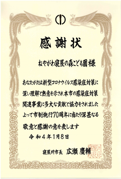 2022年01月14日(金) 市制施行70周年記念式典で表彰されました! カテゴリー:こども園からのお知らせ 令和4年1月8日に寝屋川市民会館 大ホールで開催された「市制施行70周年記念式典」にて新型コロナウイルス感染症対策関連事業に協力した団体として、ねやがわ寝屋の森こども園・ねやがわ成美の森こども園が特別表彰されました。表彰されたその協力団体の代表として当法人の理事長 田中啓昭が登壇し、寝屋川市長より直接、感謝状を拝受しました。 これからも寝屋川市の子どもたちのために、ひいては寝屋川市の発展のために、市政に協力をしていきたいと思います。