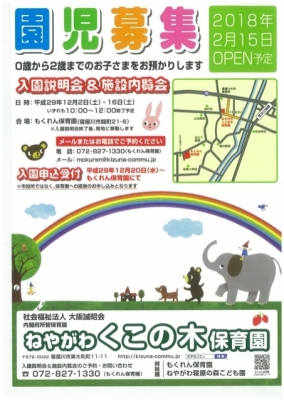当法人の3園目の施設になる企業主導型小規模保育施設を京阪 寝屋川市駅前のベル大利商店街内(寝屋川市東大利町11-11:京阪 寝屋川市駅 徒歩4分)に平成30年2月下旬にオープン予定です。