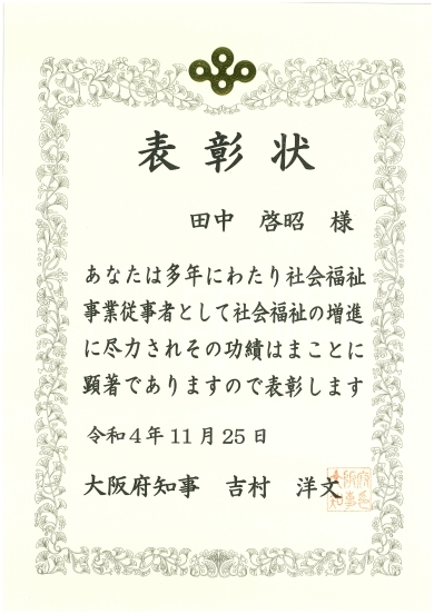 令和4年11月25日(金)に大阪国際交流センターで開催された「令和4年度 大阪府社会福祉大会」で大阪府社会福祉事業従事者知事表彰を大阪府知事より拝受いたしました。