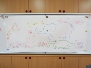 描き始めると、子ども達からは「ぞう!」「ぶた!」等大きな声で当ててくれる姿が見られました。