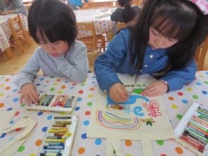 3本のクレパスを一緒に持って描くやり方等、様々な技法で楽しまれました。