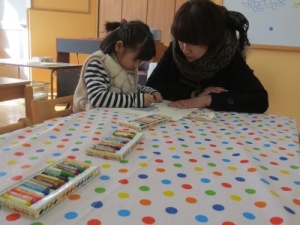 今回のワークショップの為にふくだ先生が描いて下さったイラストにクレパスでぬりえをしました。