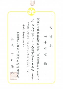 第2次寝屋川市地域福祉活動計画「未来福祉ねやがわプラン」未来福祉デザイン会議の常任委員を、寝屋川市社会福祉協議会より拝命いたしました。期間は平成33年3月末日までと長期間にわたってですが、寝屋川市の未来のために微力ながら尽力したいと思います。