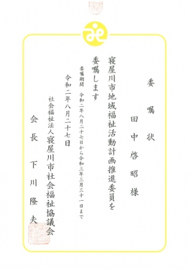 寝屋川市子ども・子育て会議 委員を寝屋川市長より、そして寝屋川市地域福祉活動計画策定委員及び寝屋川市地域福祉活動計画推進委員を寝屋川市社会福祉協議会より委嘱されました。