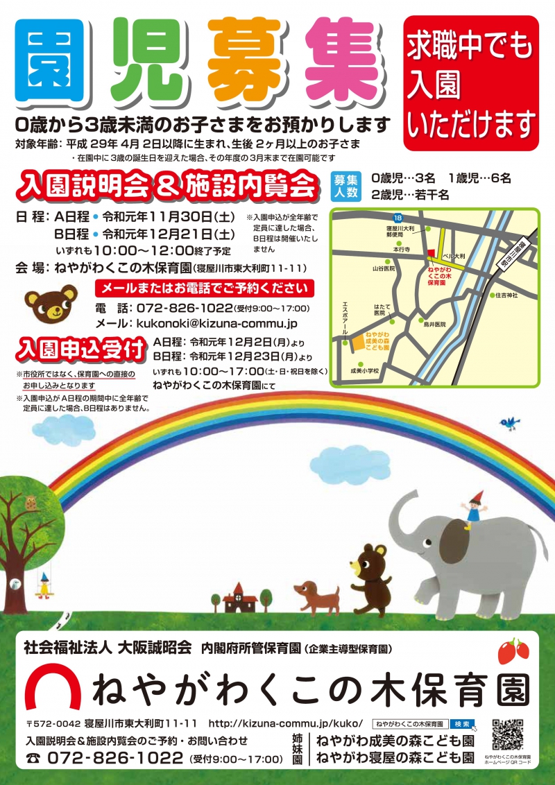 その「ねやがわ くこの木保育園」の令和2年度の園児募集がスタートし、下記の日程で入園説明会&施設内覧会を開催することが決定いたしました。