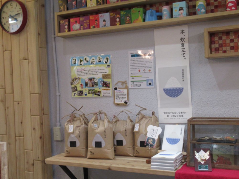 お店の一角には、子ども達が育てたお米「コドモニシキ」や2年前に当法人が出版した食育書籍『保育園産の米』のコーナーも設けてくださいました。