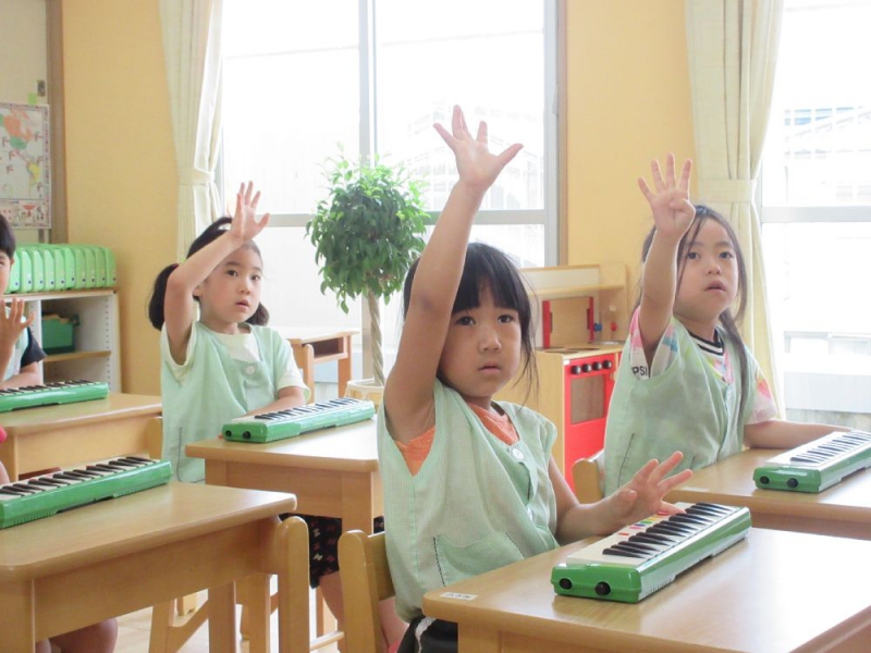 ぱんだ組(4歳児)・らいおん組(5歳児)が取り組んでいる鍵盤ハーモニカは、パイプから息を吹き込んで音を鳴らす楽器なのですが、今はパイプは使わず鍵盤で指の練習を行っています。