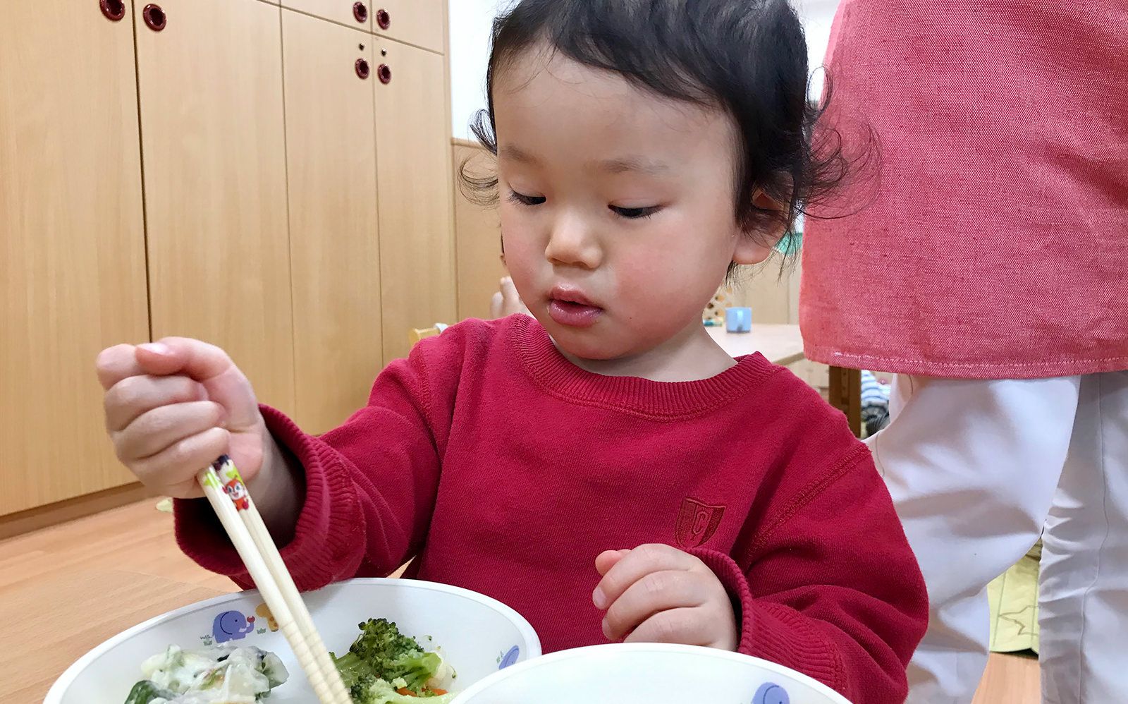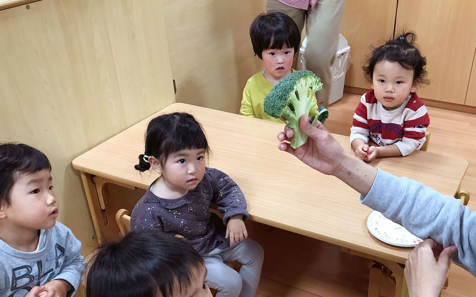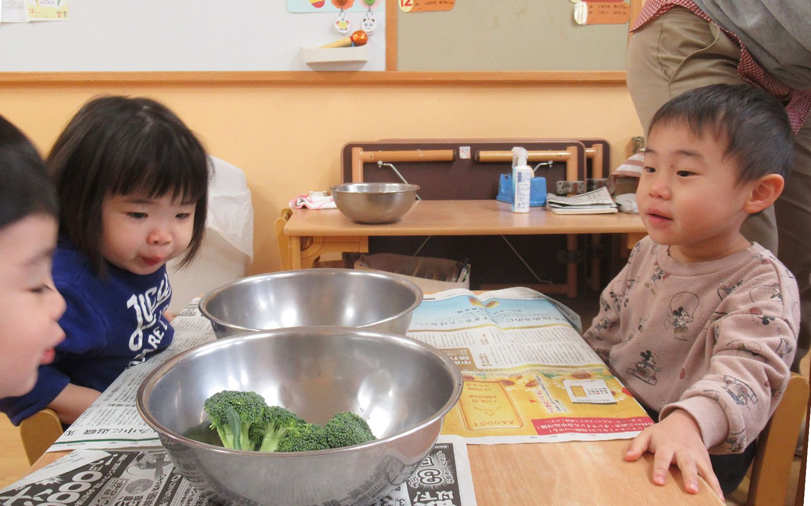 今回は、昨年12月に2歳児クラスで行った、給食メニュー「花野菜サラダ」に入れるブロッコリーの房取り体験の様子をご紹介します。