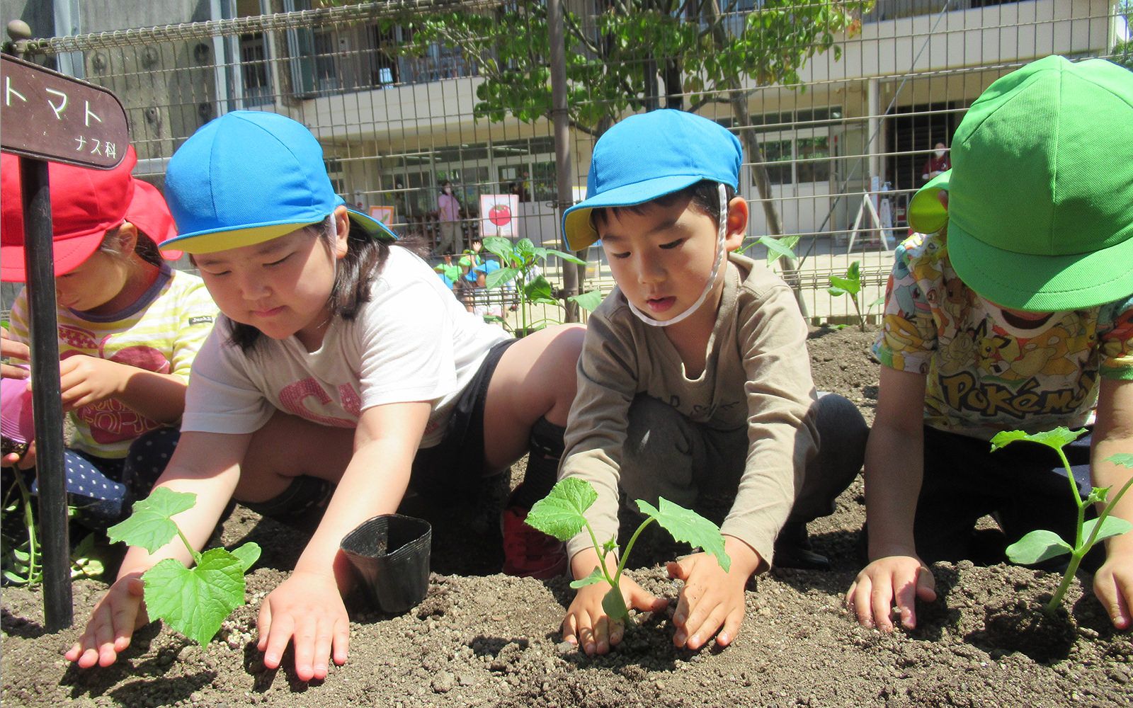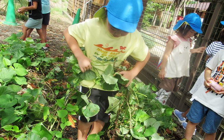 子どもたちが大好きな『KIDS FARM』。こちらでは子どもたち自らの手によって、年を通じてさまざまな野菜を栽培しています。春にはトマト、きゅうり、ピーマン、オクラなどの夏野菜を。それらの収穫が終わるとサツマイモ、玉ねぎ、大根などと、季節に応じた野菜の苗を植え、育て、収穫し、そしてみんなでその美味しさをみんなで味わいます。