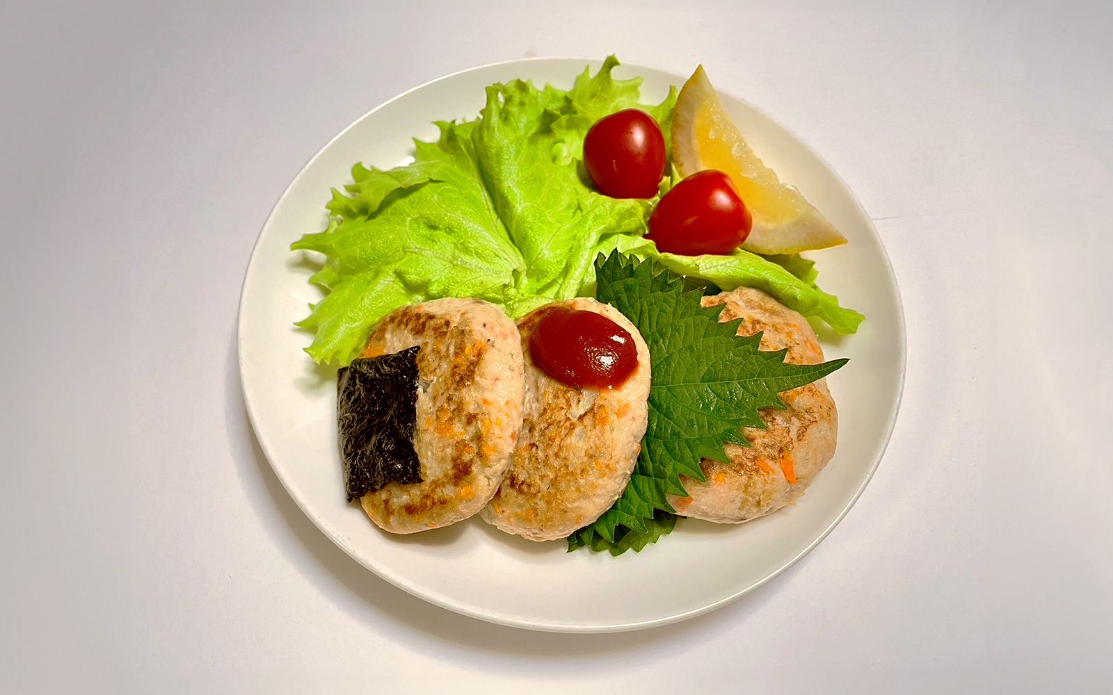 - 焼きあがったら、それぞれのりと大葉で巻き、残り一つはケチャップをかける。